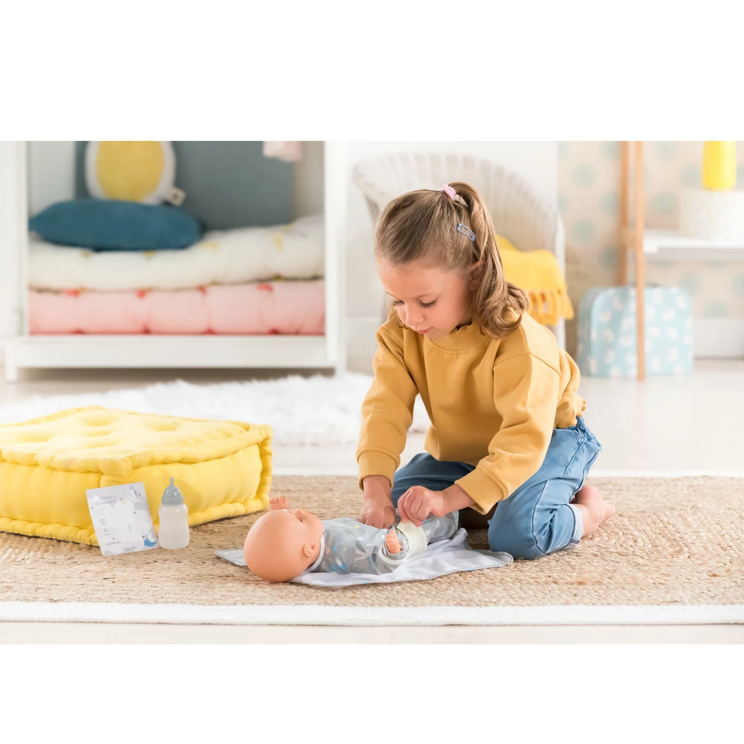 Le Coffret Nouveau-Né est un coffret avec un grand poupon pour jouer et faire comme les grands. Avec ses quatre accessoires, sa couverture, sa couche repositionnable, son bracelet de naissance, son biberon à remplir accompagnés d’un certificat de naissance bilingue recto verso, le Coffret Nouveau-Né permet aux enfants de rejouer l’arrivée d’un bébé dans la famille ! Le grand poupon Nouveau-Né mesure 36cm, une taille parfaitement adaptée aux petits bras de l’enfant pour le câliner, le materner et imiter les gestes qui font devenir grand. Son visage, ses bras et ses jambes, à la délicate senteur de vanille, sont en vinyle doux au toucher. Son corps est souple pour faciliter ses mouvements. Avec ses yeux dormeurs, il fait dodo quand on le couche sur le dos.