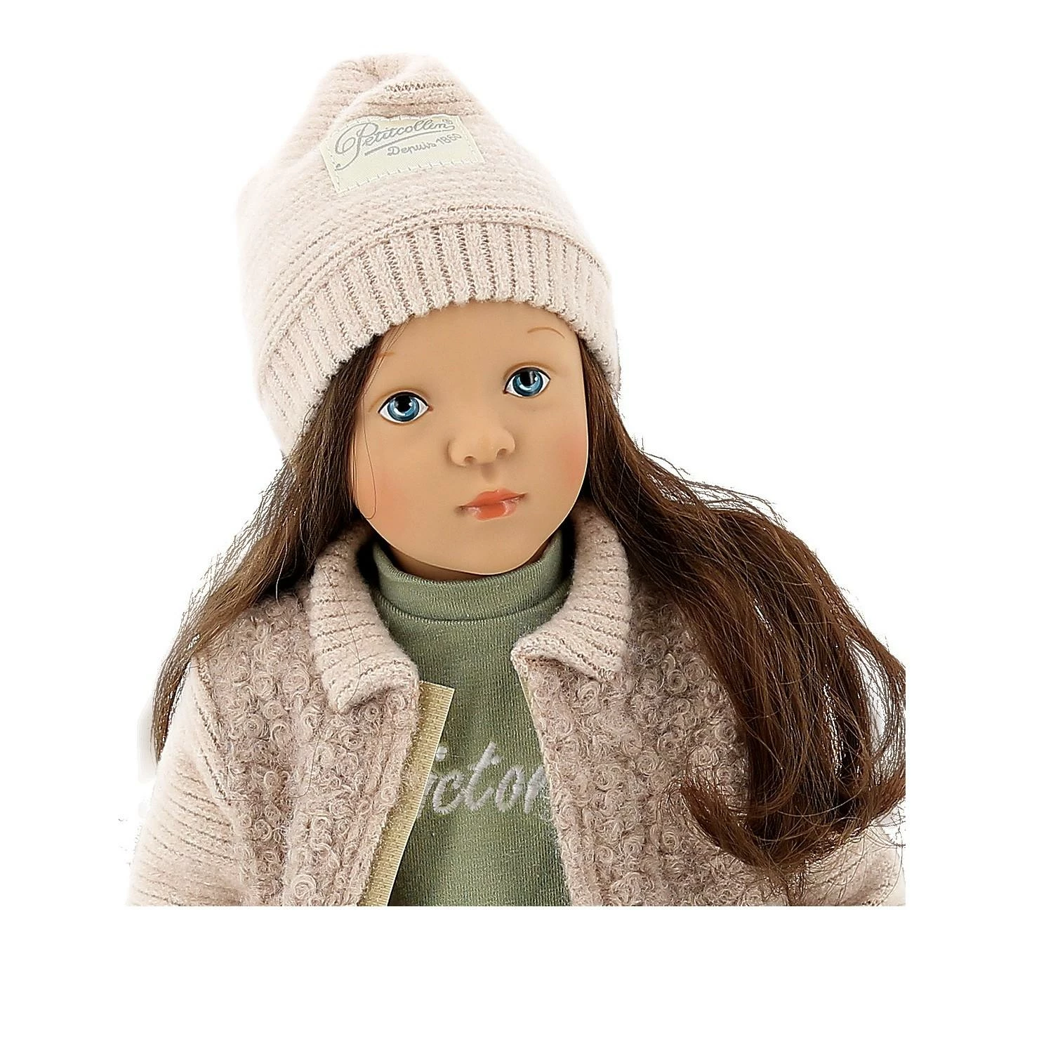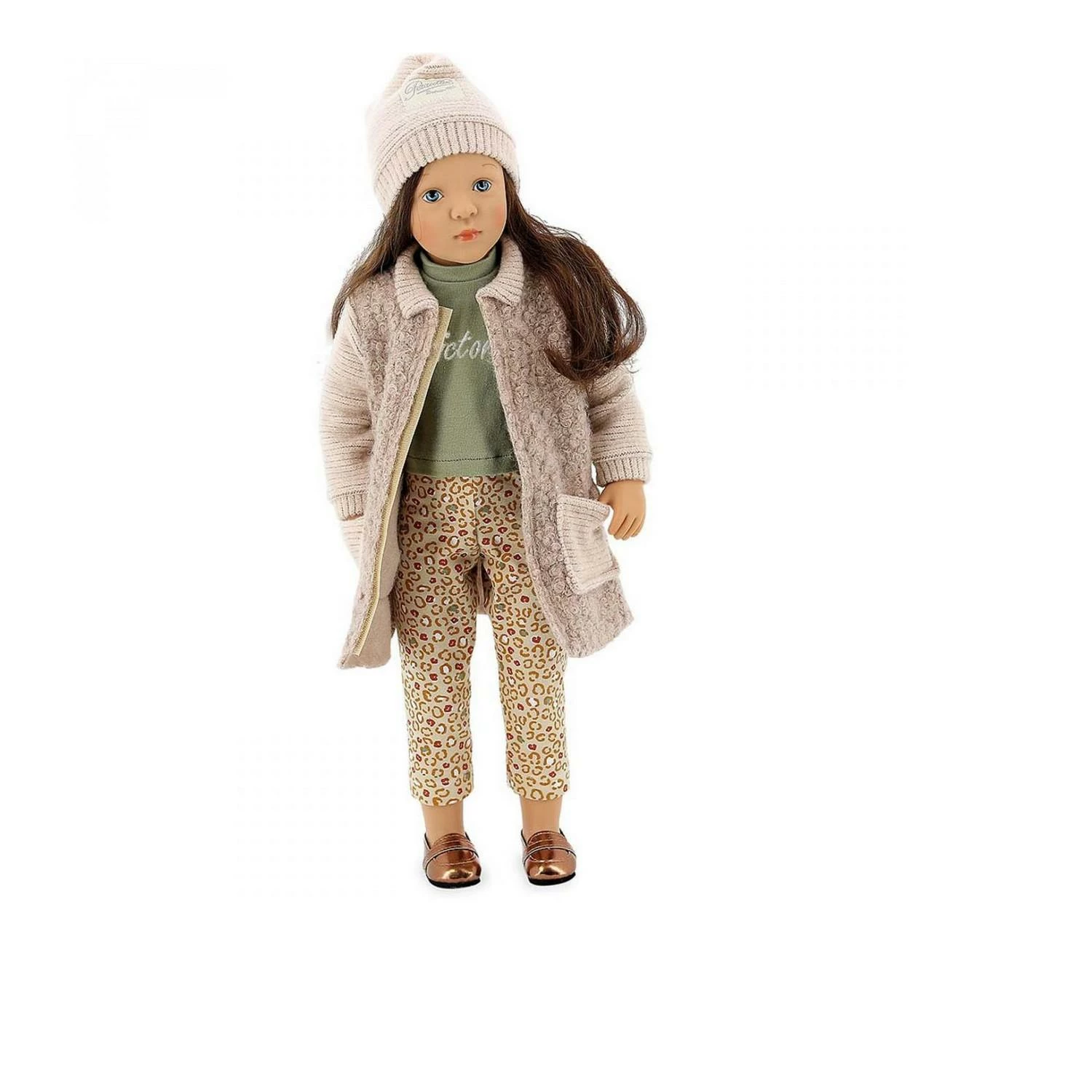 Cette jolie poupée Finouche est entièrement en vinyle dur. Elle porte un joli Tee-shirt vert brodé (avec son prénom Victoria) sur un pantalon à motif léopard. Un beau manteau beige et un bonnet complètent sa tenue. Des mocassins couleur café la chaussent parfaitement.