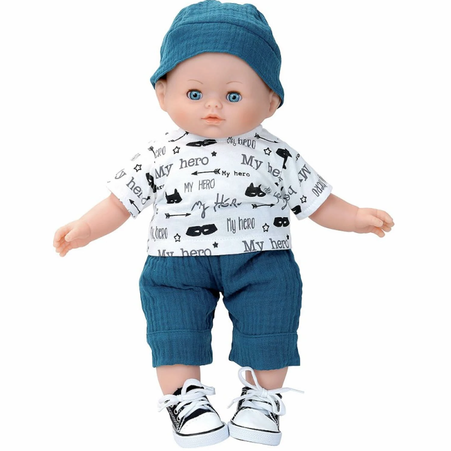 Marius est un bébé haut de 36 cm de la collection Petit Câlin aux cheveux peints blonds. Votre enfant va adorer son look tendance avec son pantalon bleu, son tee-shirt à manches courtes sur le thème des super-héros, son chapeau bleu assorti au pantalon et ses baskets modes.