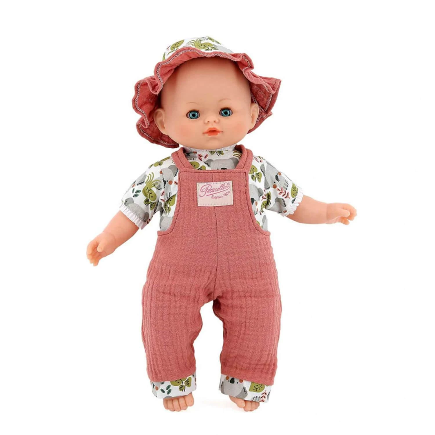 Mariette est habillée avec une belle salopette tendance en double gaze couleur terra cotta associée au chapeau de la même couleur et d’un tee shirt motif koala.