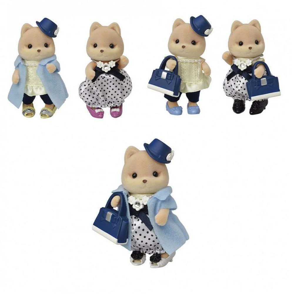Ce set comprend une figurine grande sœur chien caramel, une étagère pour ranger tous ses vêtements, une robe, un pantalon, un chemisier, un manteau, un sac, un chapeau, un collier et 6 paires de chaussures.