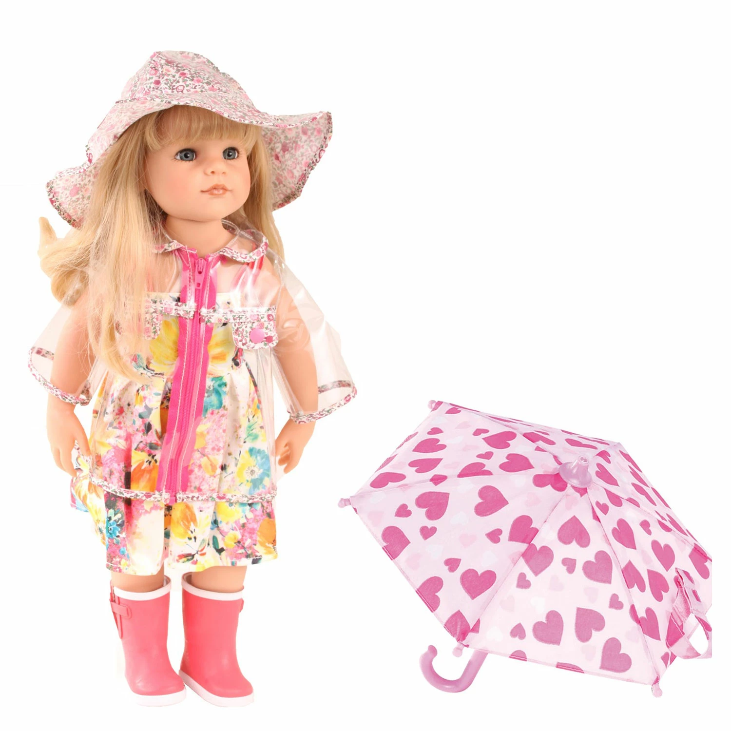 S’il pleut, habillez votre poupée de manière imperméable afin qu’elle n’attrape pas froid et qu’elle ne tombe pas malade. Ce set est composé de plusieurs éléments permettant à la poupée de e protéger de la pluie : un imperméable plastifié et transparent avec, par endroits, des motifs fleuris. Il se ferme et s’ouvre à l’aide d’une fermeture éclair. Un chapeau, en plastique aussi avec les mêmes motifs fleuris que ceux de la veste.